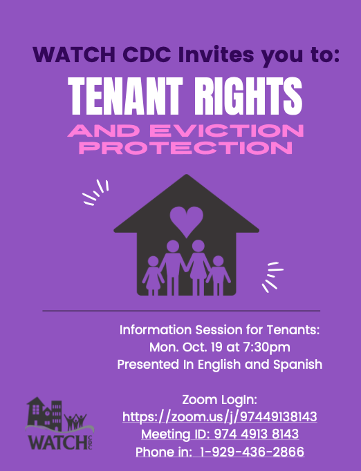 WATCH CDC invites you to Tenant Rights and Eviction Protection forum on Zoom on October 19 at 7:30pm. The forum will be focused on educating tenants of their rights and how to prevent eviction under the Federal Eviction Moratorium. Zoom Log In: https://zoom.us/j/97449138143 Meeting ID: 974 4913 8143 Phone in: 1-929-436-2866 WATCH CDC te invita…
