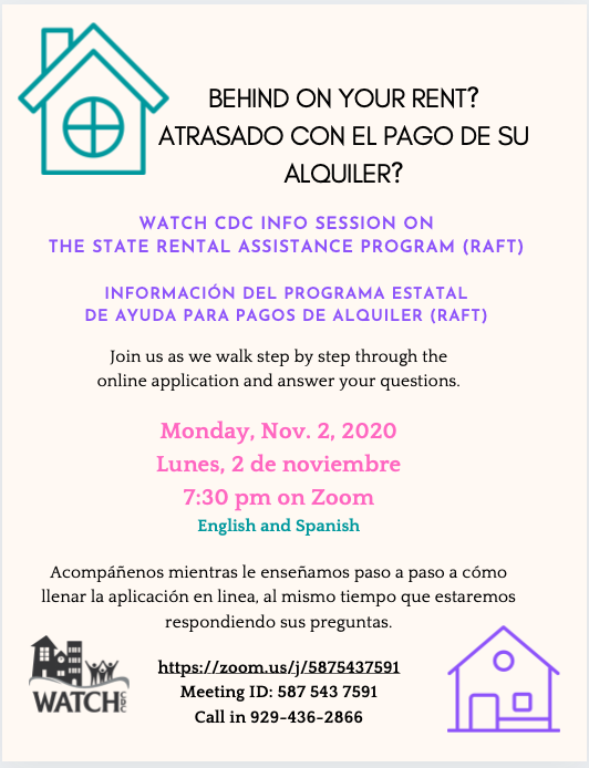 Join us on November 2nd at 7:30 via zoom, as we break down the in’s and out’s of the Massachusetts rental assistance program, RAFT. We will be walking you through the online application and answering any questions you may have. https://zoom.us/j/5875437591 Meeting ID: 587 543 7591 Call in 929-436-2866 Acompáñenos el 2 de noviembre a…