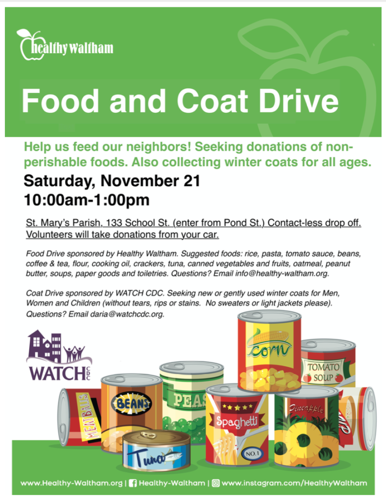 Healthy Waltham and WATCH CDC are partnering to host a Food and Coat Drive for Waltham residents. Seeking non-perishable food donations such as rice, pasta, tomato sauce, beans etc. Seeking new or gently used winter coat donations for men, women and children, all ages. Coat donations must be free of rips, tears and stains. No…