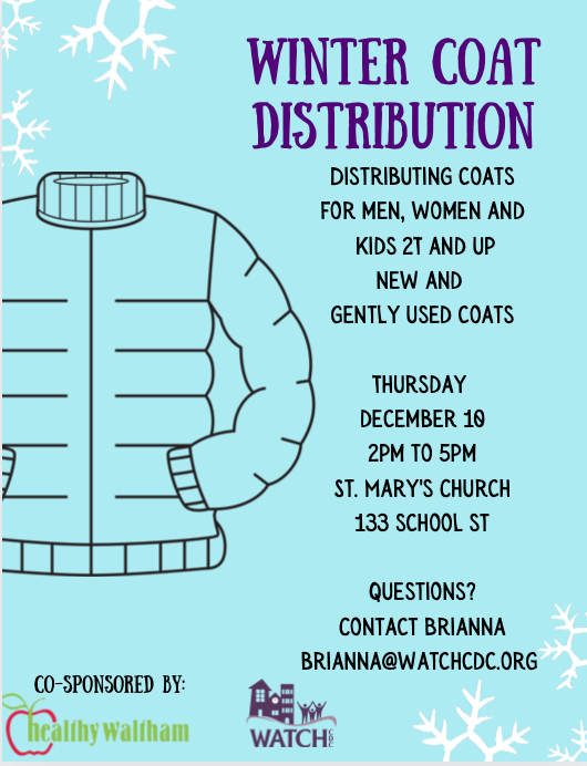 WATCH and Healthy Waltham have partnered for a Winter Coat Distribution on December 10th from 2pm to 5pm at Saint Mary’s Church, 133 School St. Distributing new and gently used coats for men, women and kids 2T and up. Questions? Contact Brianna WATCH y Healthy Waltham se han colaborado para una distribución de abrigos de invierno el 10 de…