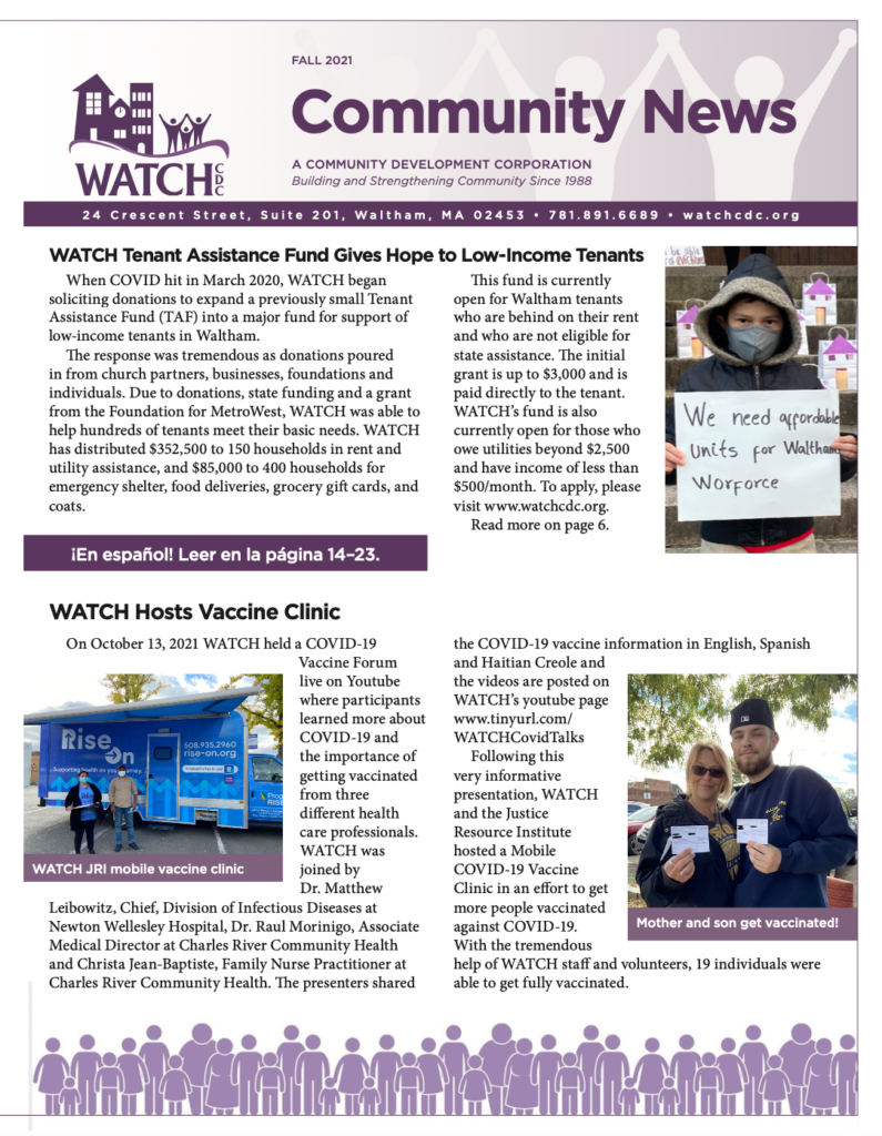 The Fall 2021 Newsletter is out now! Thank you to all of our clients and partners who have made this last year so special. We continue to look forward to serving the Waltham community. Read the newsletter here: WATCH Newsletter Fall 2021 El boletín de otoño de 2021 ya está disponible. Gracias a todos nuestros clientes…