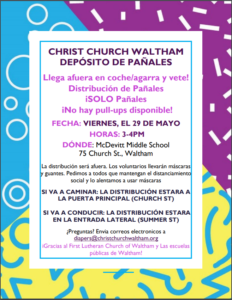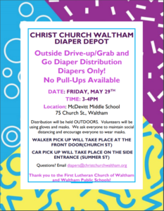 Diaper Depot Posted on: May 21, 2020 Diaper Depot returns next Friday!This is a free distribution of diapers for Waltham residents. Friday, May 29 3-4pm McDevitt Middle School, 75 Church St Posted in Historical News