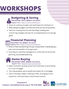 One of these organizations, Newton-Wellesley Hospital recognizes and supports WATCH CDC's mission and has decided to grant WATCH CDC a grant to develop a Job and Financial clinic to support the community of Waltham. The Job and Financial Clinic's mission will be to mentor low-income community members in fields such as goal settings, budgeting, financial management, job searches, resume writing, and interview preparation. The Job and Financial clinic will allow WATCH CDC to continue its mission by providing extended mentoring to increase the financial circumstances and self-sufficiency of members within its community. In collaboration with Newton-Wellesley Hospital, WATCH CDC will continue its mission of creating a just community within the Waltham community.