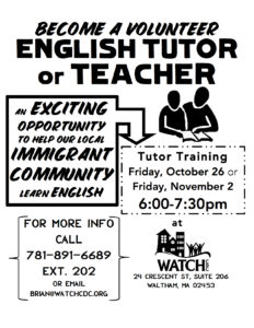 Teacher and Tutor Training Posted on: October 23, 2018 An Exciting Opportunity to help our local immigrant community members learn English! print flyer here: tutortrainingflyer fall18 Posted in Historical News