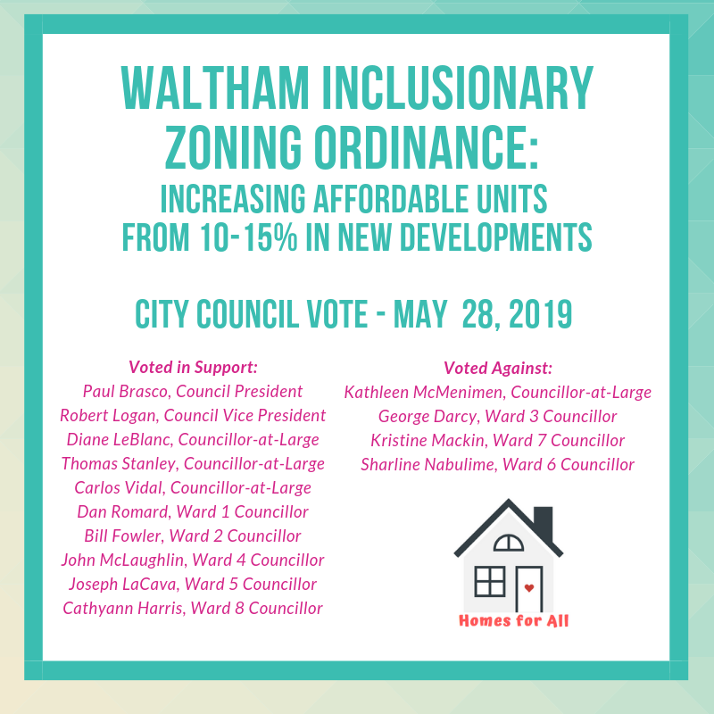 Waltham had a chance to take a step toward more affordable housing, and you made it happen! Over 30 WATCH supporters packed the City Council chambers last Tuesday and watched as Waltham Councilors voted to increase inclusionary zoning in our city. With the new measure passed, all new housing developments in Waltham will have make at least 15% of their units affordable – an increase from the old 10% requirement.